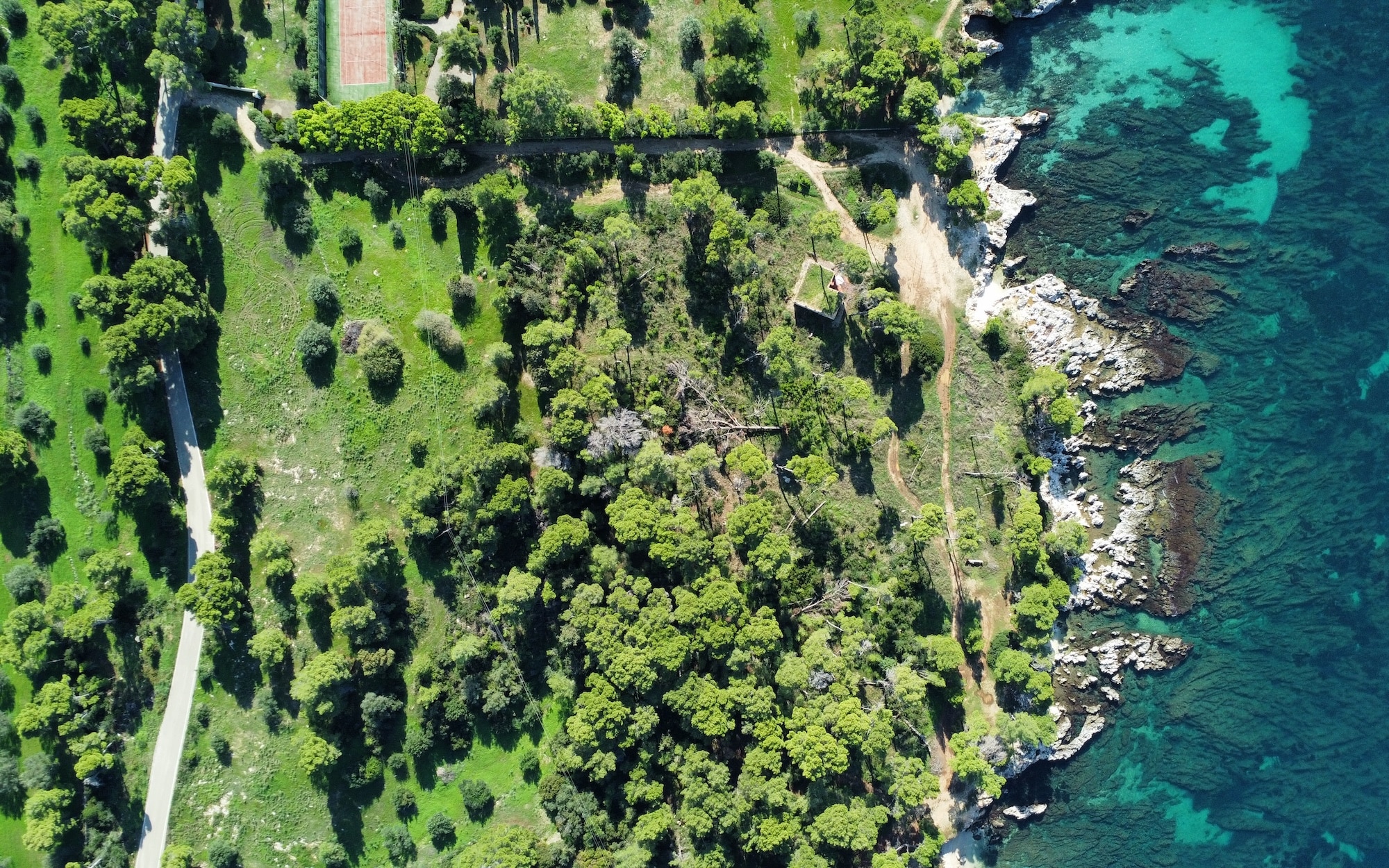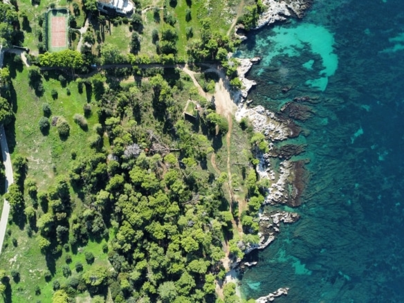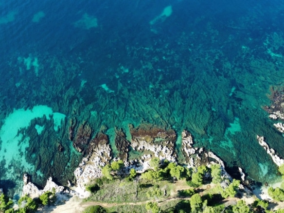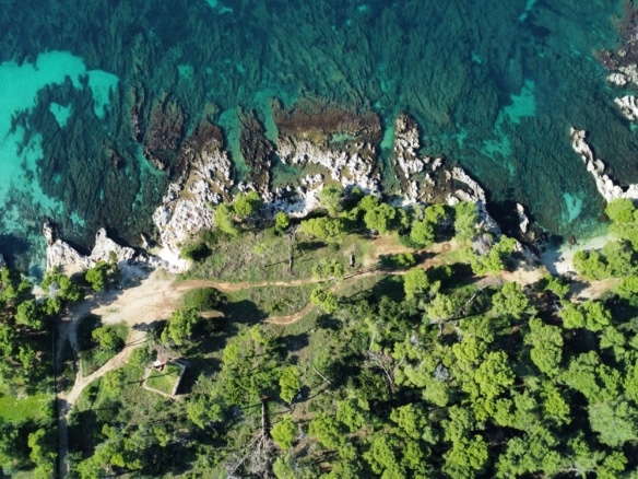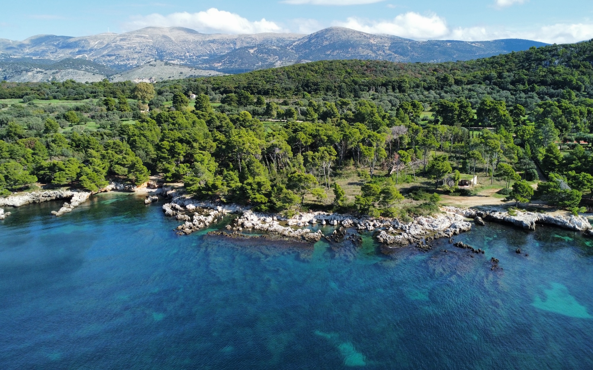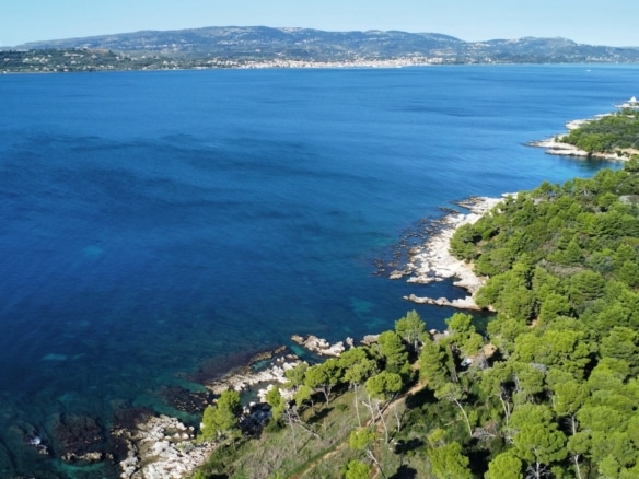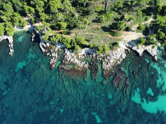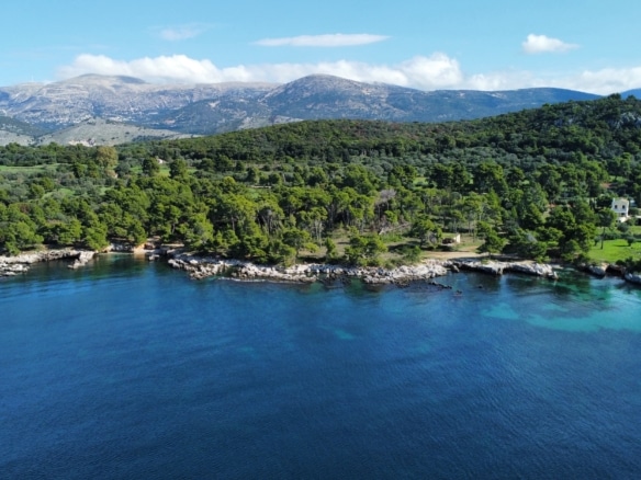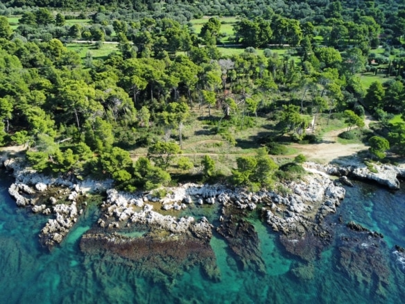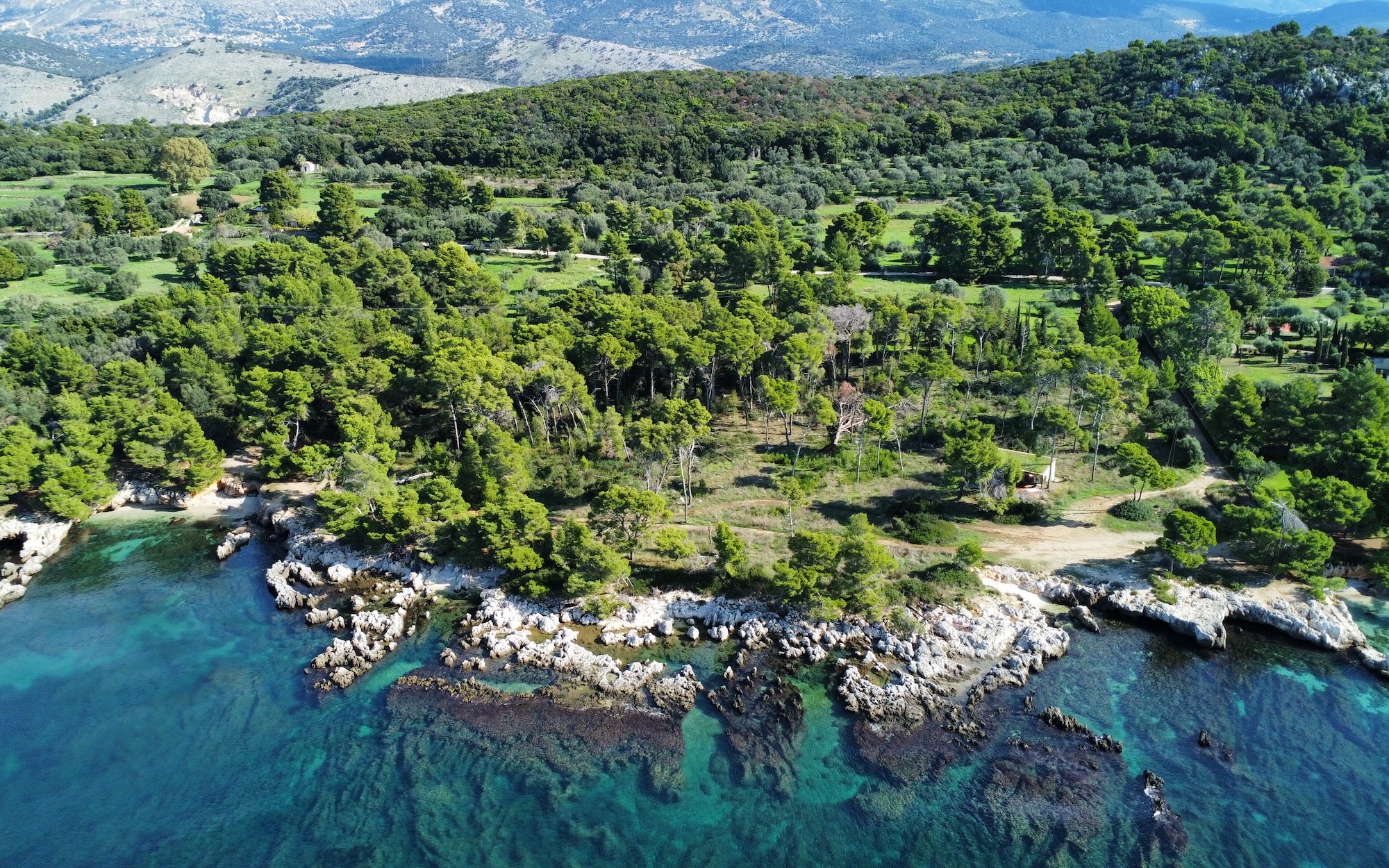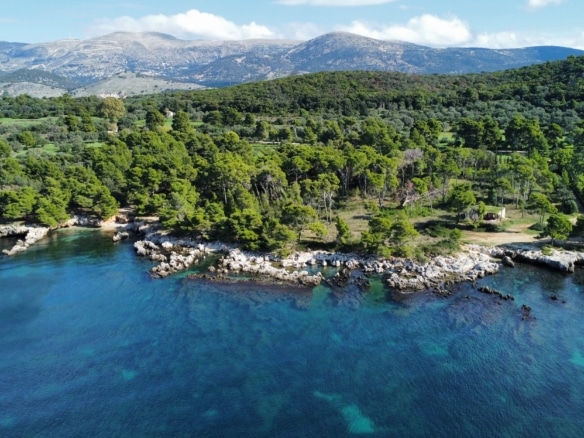 Surrounded by lush pine and olive trees, the land stretches gently down to the crystal-clear turquoise waters, forming small natural coves and rocky inlets perfect for swimming or mooring a private boat. The coastline is a stunning blend of rugged limestone and pristine shallows, showcasing the island’s authentic charm.