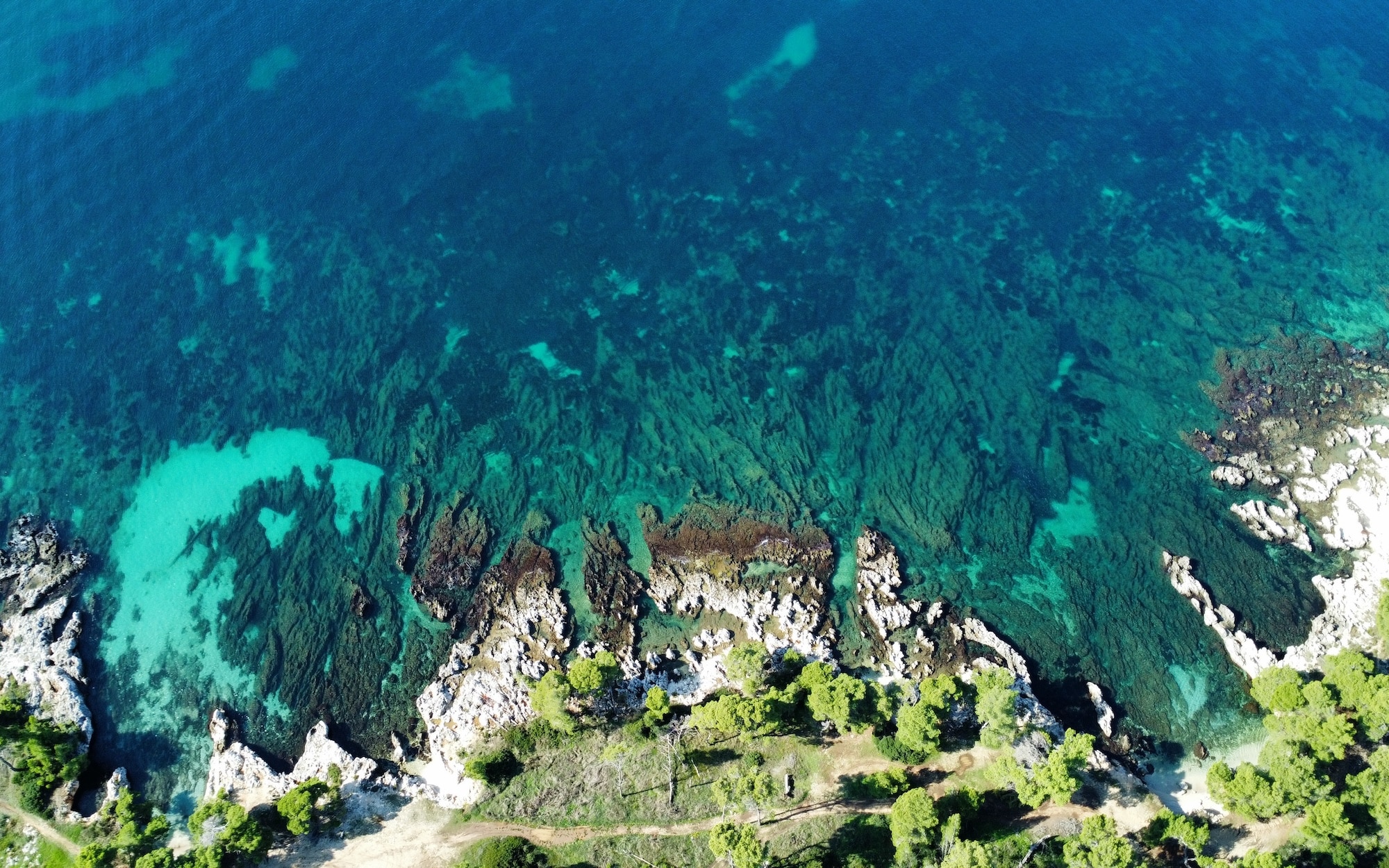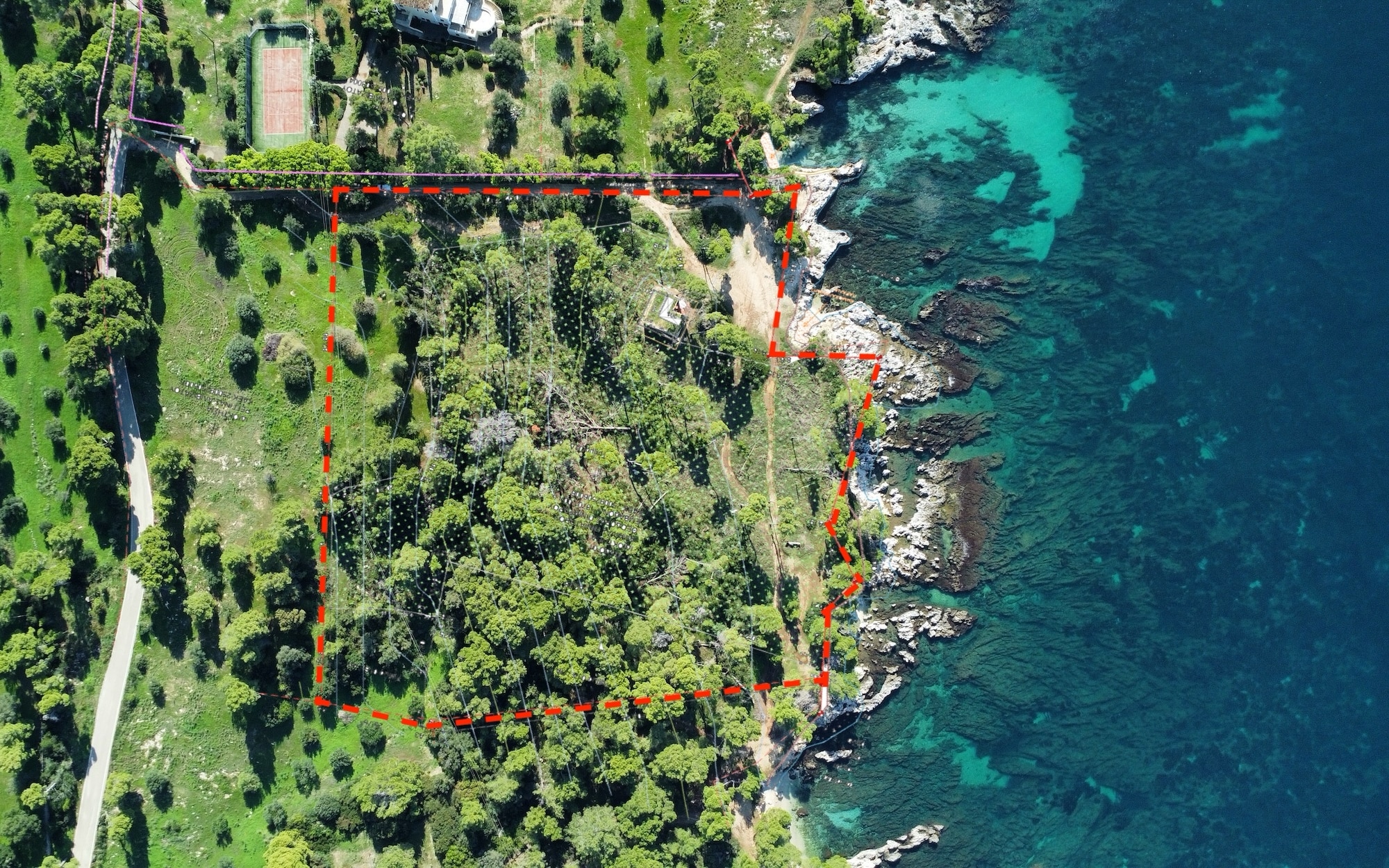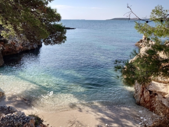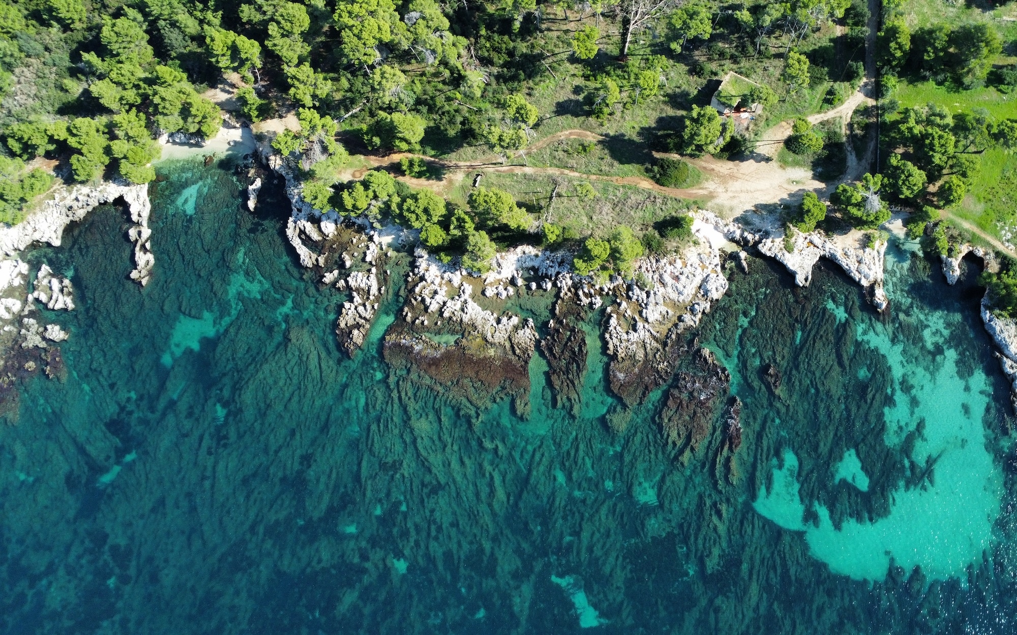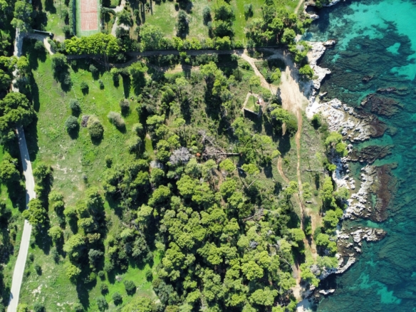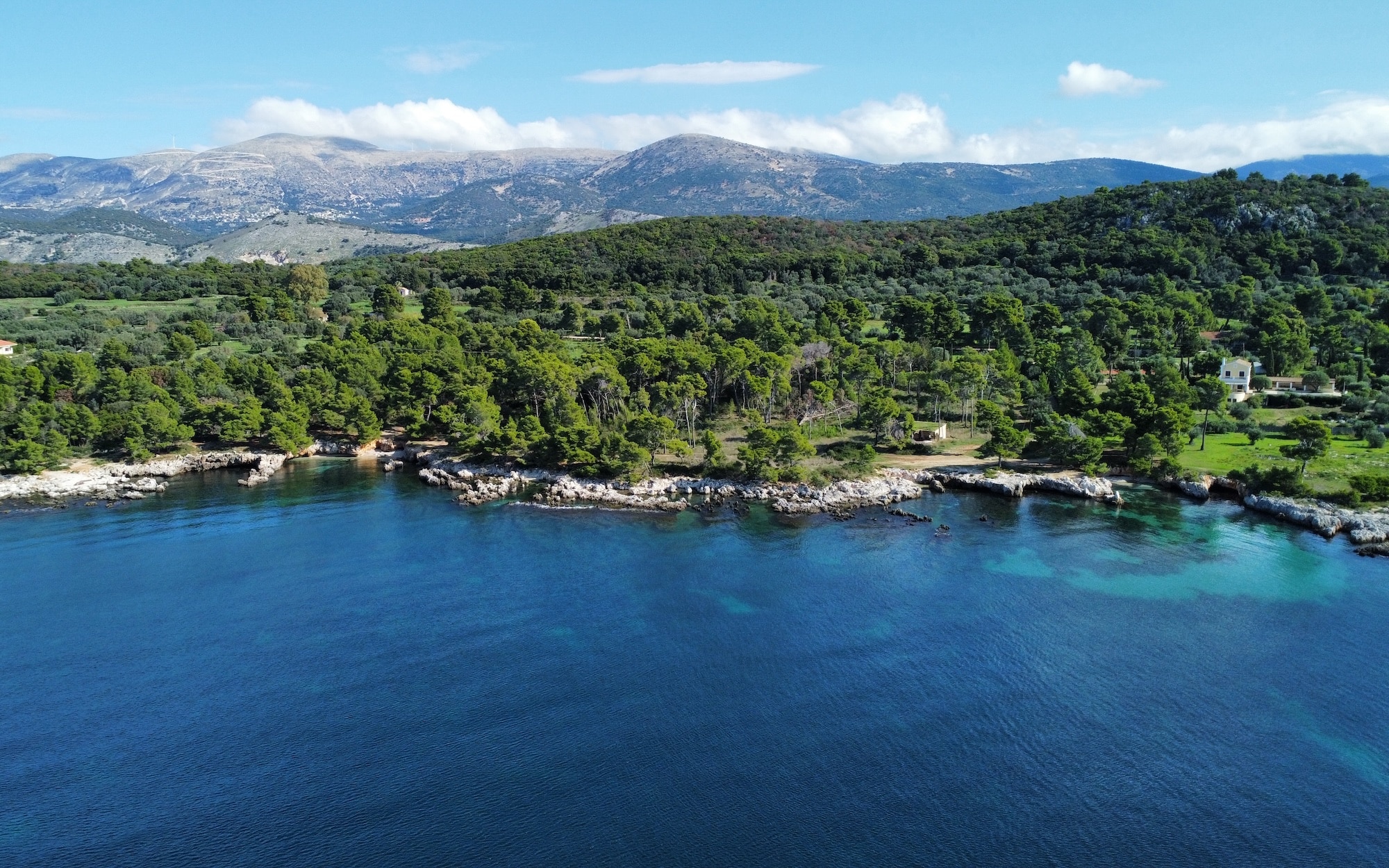 Surrounded by lush pine and olive trees, the land stretches gently down to the crystal-clear turquoise waters, forming small natural coves and rocky inlets perfect for swimming or mooring a private boat. The coastline is a stunning blend of rugged limestone and pristine shallows, showcasing the island’s authentic charm.